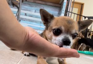 歯ブラシが苦手なコロくん、今日は歯ブラシに自らタッチすることから練習スタート!